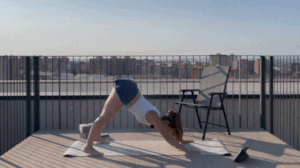 1 kettlebell de entre 4-10kg (recomiendo 6-8kg), 1 goma de números, 2 bloques de yoga, esterilla y 1 silla. Opcional: goma pequeña cerrada.